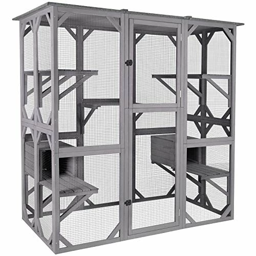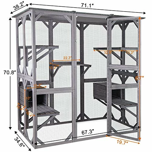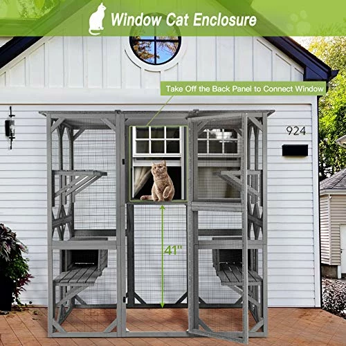 - Aivituvin Cat House Outdoor Catio Kitty Enclosure Oversized convenient front door at 67″ with safety latch allows adult people to access the cat enclosure to interact with the pets, while making cleaning easier