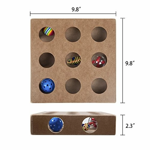 - INCLUDES : 1Β box, 2Β rattle ball,Β foam ball, 1 toy mouse. Box size : length 9.8″, width 9.8″, height 2.4″. Hole diameter : 1.7″.