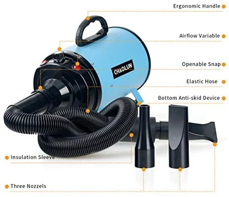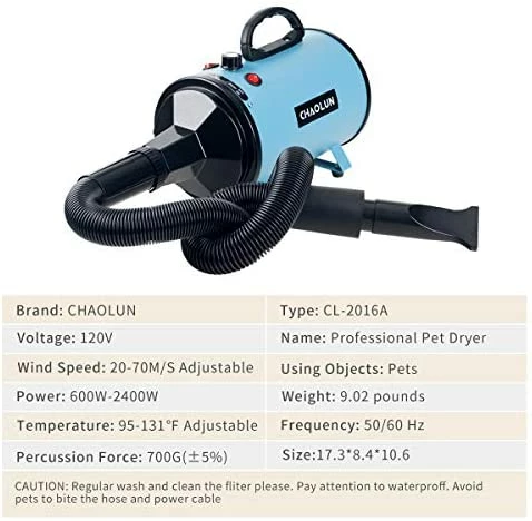 - POWERFUL BLOW FORCE & STEPLESS ADJUSTABLE SPEED: Professional pet hair dryer equipped with a powerful and stable motor. Output power: 600W-2400W. Stepless Adjustable Speed. Whether it’s a giant dog or mini cat, it can quickly dry. You can choose different wind level with your pet size. Give your lovely pet a thorough dry after shower.