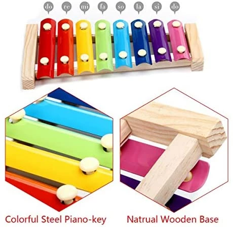 - Size and Material: Wood base and metal keys. The body of the xylophone is 24*12*3cm/9.4*4.7*1.2inches. The Chains are 30cm/11.8inches long.