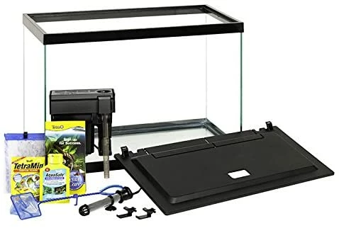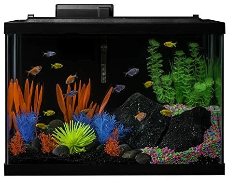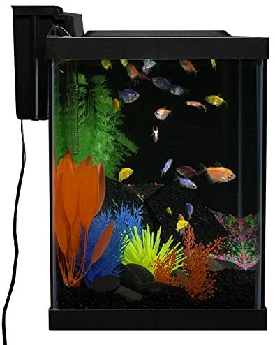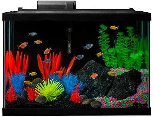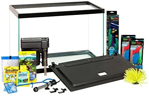 - INCLUDES ALL THE ESSENTIALS FOR SUCCESS: This GloFish aquarium kit includes a 20 gallon glass aquarium, LED hood, Tetra mini UL heater, Tetra Whisper 20 filter, GloFish 13″ LED light stick, 1 GloFish yellow anemone, 2 plant multipacks, fish food and water conditioner sample as well as a set-up guide.
