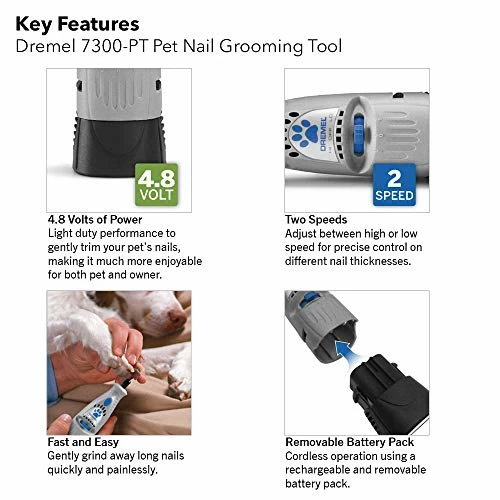 - : Dremel 7300-PT 4.8V Pet Nail Grooming Tool Two rotation speeds let you safely and carefully grind nails in stages. Battery-powered device uses a 60-grit sanding drum to comfortably trim toenails in a manner that is designed to be harmless and humane