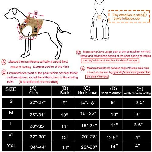 - [DOG IDENTIFIED]:Three 1″ Strips of Hook and Loop Panel Sewn onto Both in the Formation of MOLLE(size in Small :3″x4.5″ ; Medium :3″x6″ ;Large/X-large/XX-Large :3″x7.5″ ); One Strip of loop panel Sewn Along the Back of harness with different wide in each size ( Small: 2″ ; medium/Large:3″ ;X-large/XXL:4″);One Square Loop panel Sewn on The Front Chest (Size in small:2″x2″ ; Medium/Large/X-large:2″x4″ ; XX-Large:3″x4″) ,You Can Attach Many Patch to Identify Your Dog