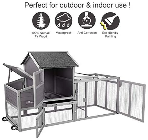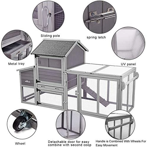 - Easy Movement: 2 Quality wheels with long design handle makes this backyard chicken house easily moveable. Placing the coop in different locations can result in happier chickens and better quality eggs!