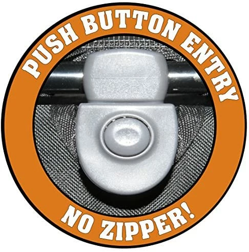- Push button easy-locking, NO-ZIP entry; 600 Denier water-resistant material; top and front mesh windows for ventilation
