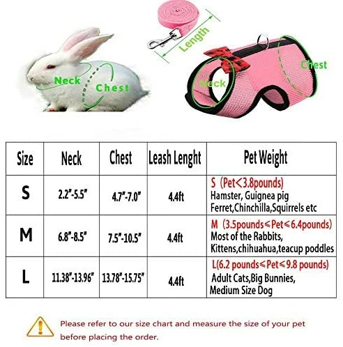 - 1.Well Neatly Sewn.Softly Material Hardness for Rabbit. It is Made of High Quality Nylon, Soft Texture and Ideal Both for Summer days and Year-Round Due to Breathable Feature. This Light Rabbit Harnesses Never Put any Strain on Your Pet’s Neck and are Designed Using Soft Material for Your Furry Friends Total Comfort.