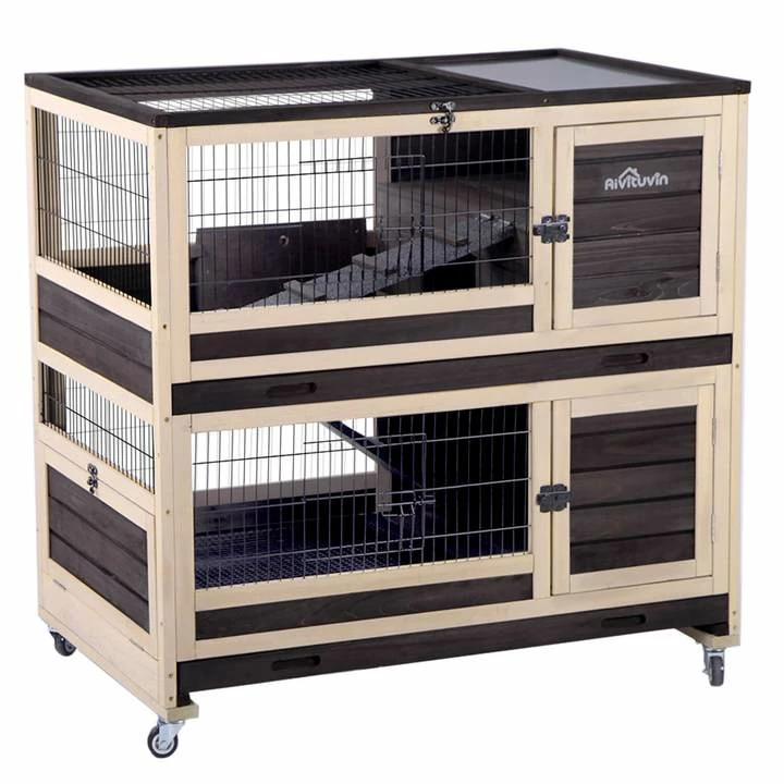 Rabbit Hutch Bunny Cage Indoor and Outdoor with 2 DEEPER removable pull out tray ! NOT LEAK! Better plastic quality, easy to clean !Rabbit Hutch Bunny Cage Indoor and Outdoor on 4 wheels easily to move, 2 of them are locking wheel to fix well and safe. Rabbit Hutch Bunny Cage Indoor and OutdoorΒ Large open roof cage for bunny,2 large side doors, 2 front door for every direction easy catch.Β design with divider, the upper and lower layers can be separated easy, 2 ramps, Double-floor, spacious and separate space for 3-4 Bunnies and other small pets, no weight limit. Large Bunny hutch added Metal feeder and chewing Toy as a special gifts.