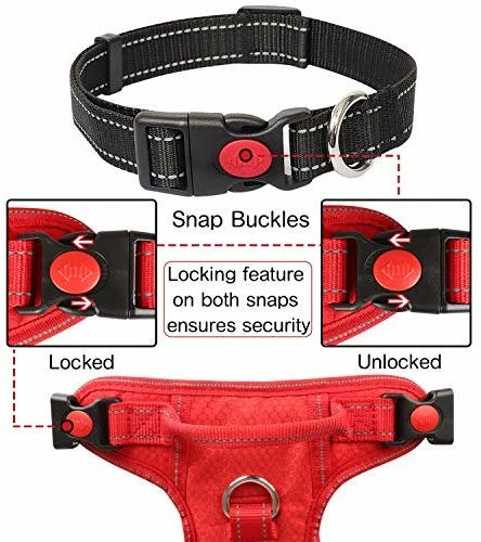 - LOCKING SECURITY AND REFLECTIVE – Locking feature on both snaps makes it much more secure, so it won’t open by accident. The reflective straps of this large dog harness maintain high visibility in the dark. The dog harness can be easy to put on/take off with the Snap Buckles