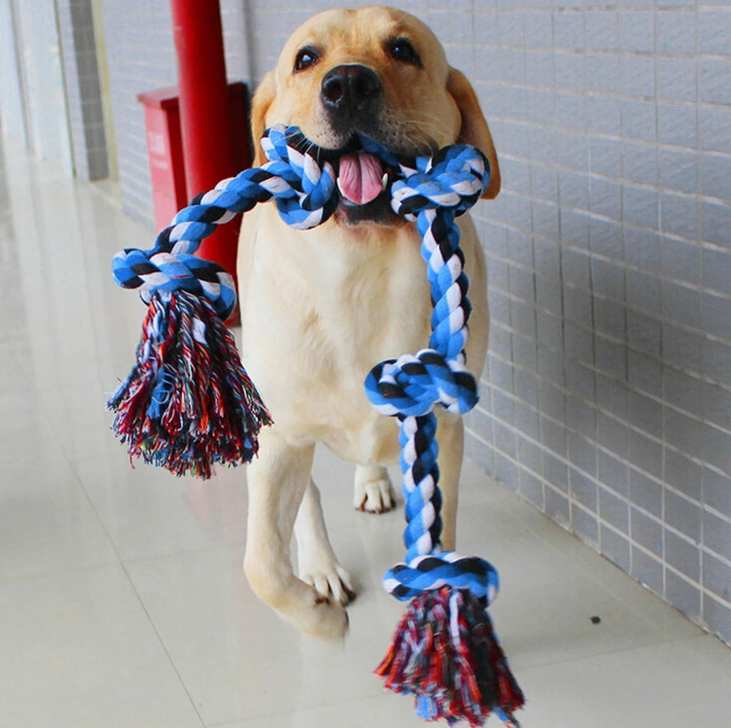 - 3 feet long, 5 knots . If your dog is an aggressive er, this is the best choice. The toys nearly indestructible, it is stronger and more durable than same type of rope toys.