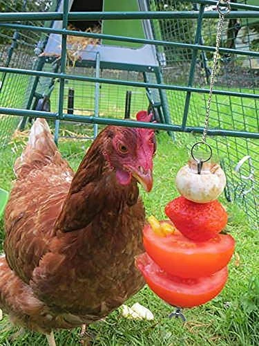 - Design: This chicken veggies feeder is designed as a skewer with hanging chain and hook, can be hung in coop easily. Hanging design prevent chickens step on the food, keep the vegatables and fruits clean and fresh. A group of chickens gather around a hanging cabbage, fighting to peck at it and enjoying themselves.